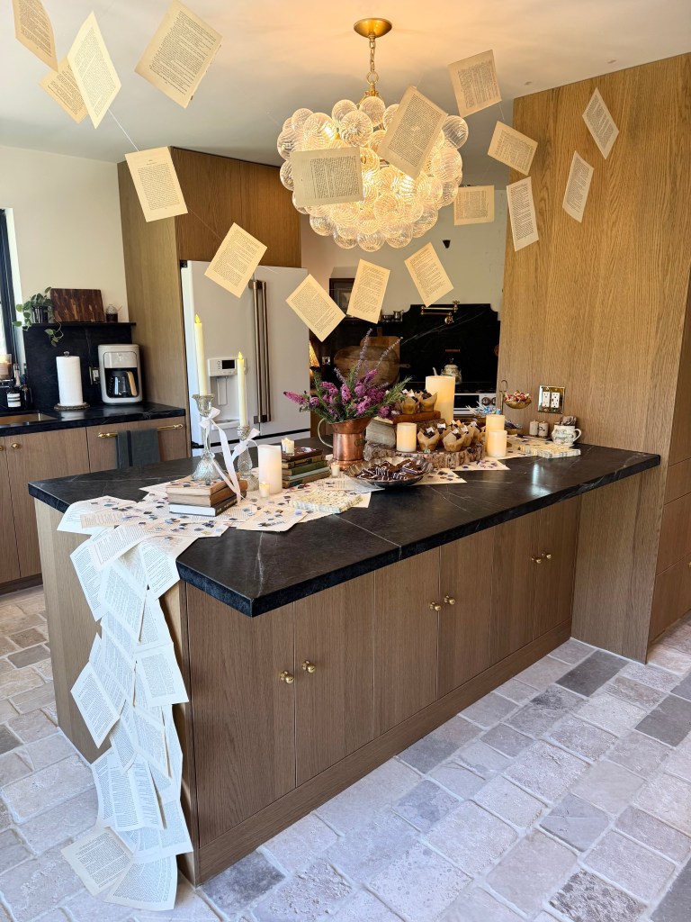 To bring the party to life, we added one of the easiest touches: a book page garland. We taped torn pages to fishing line at random and hung the strands from the ceiling. It took only a few minutes, but the impact was huge—it felt whimsical, like words were floating all around us.