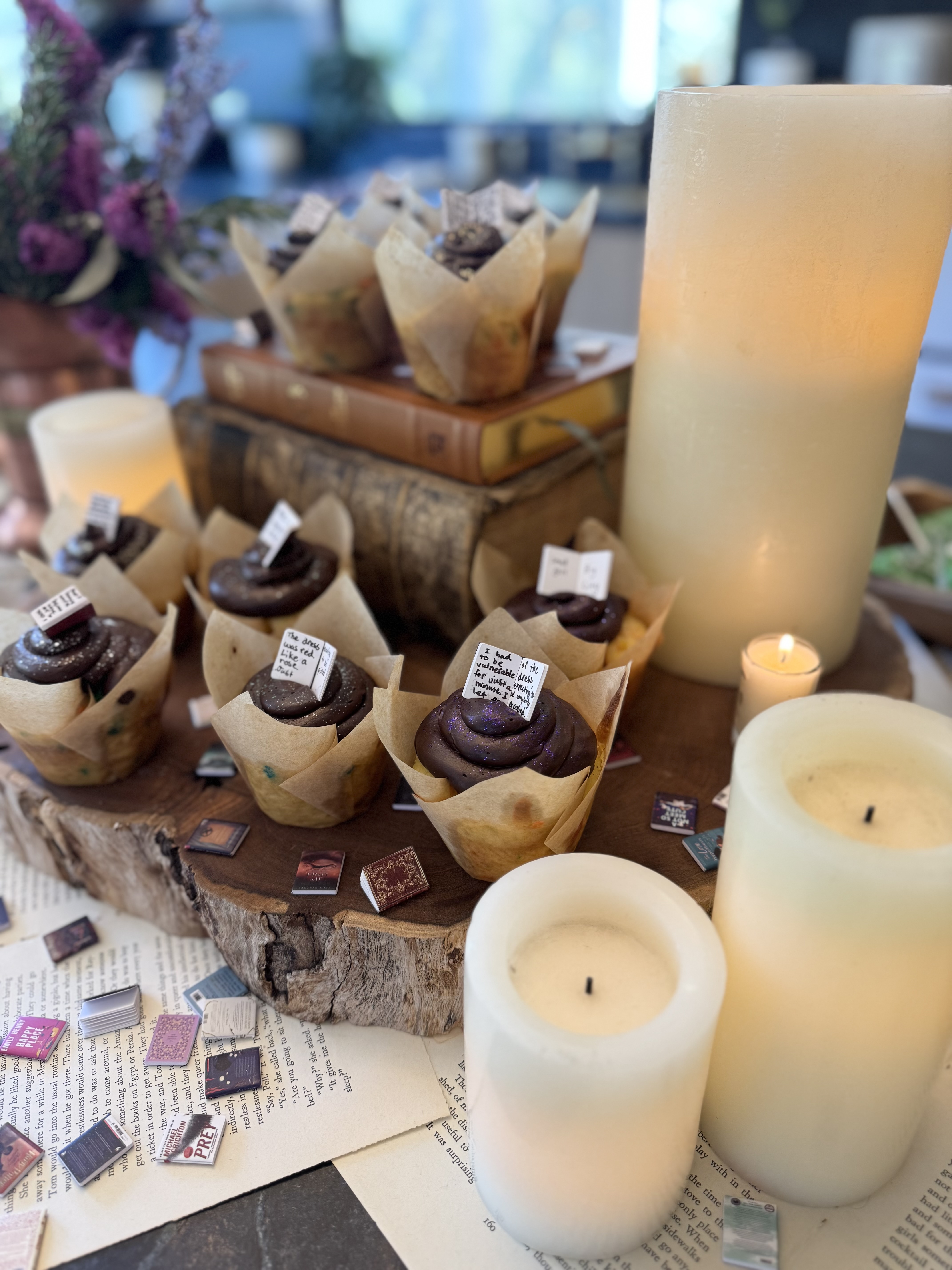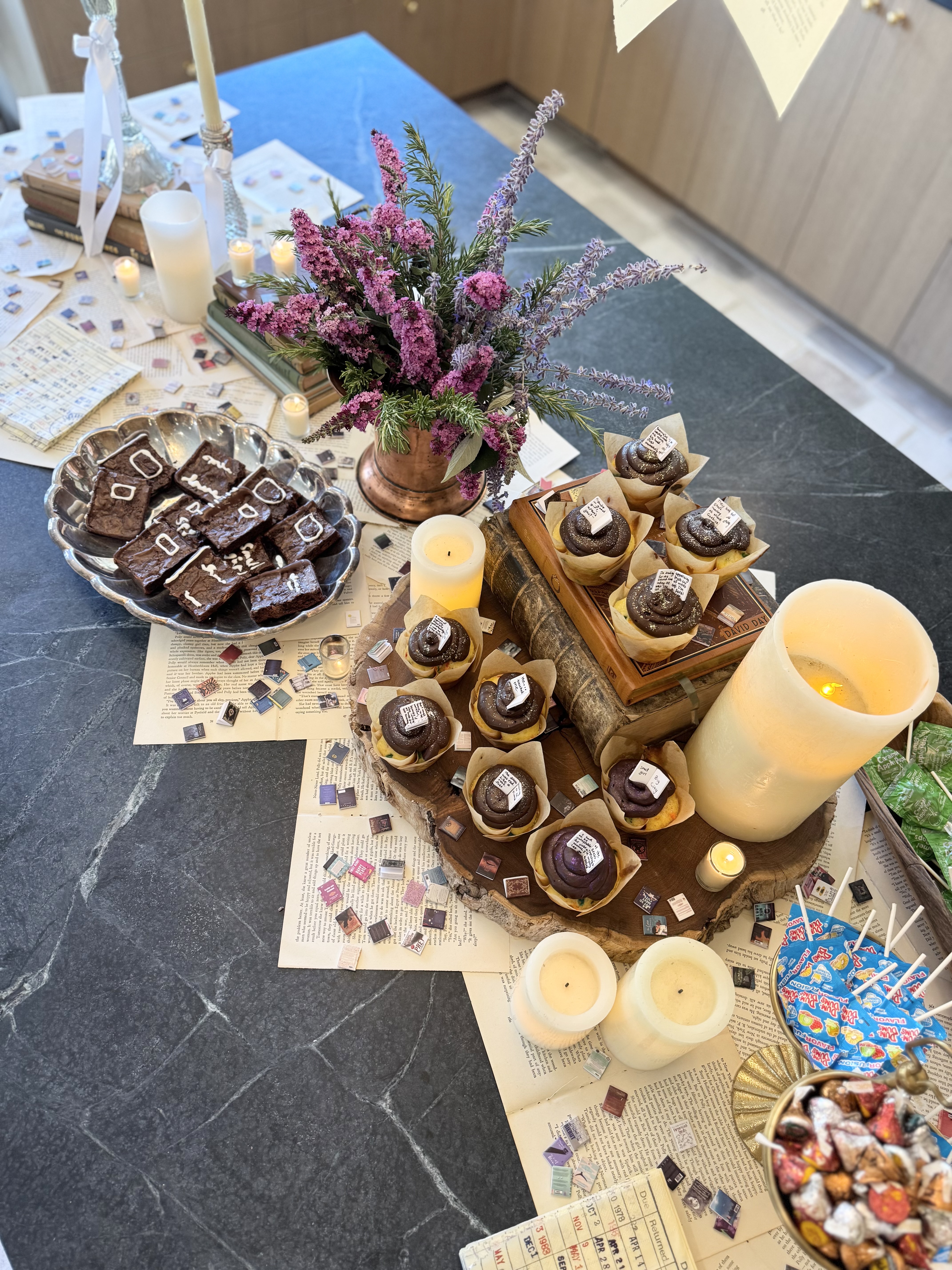 Of course, the treats were the highlight. My daughter baked brownies that she made look like old books. Watching her dive into the theme with so much creativity was pure joy. She topped each cupcake with little book toppers we found on Amazon and even wrote quotes from each girl’s favorite story to personalize them. As a final touch, we scattered tiny mini books as confetti across the table.