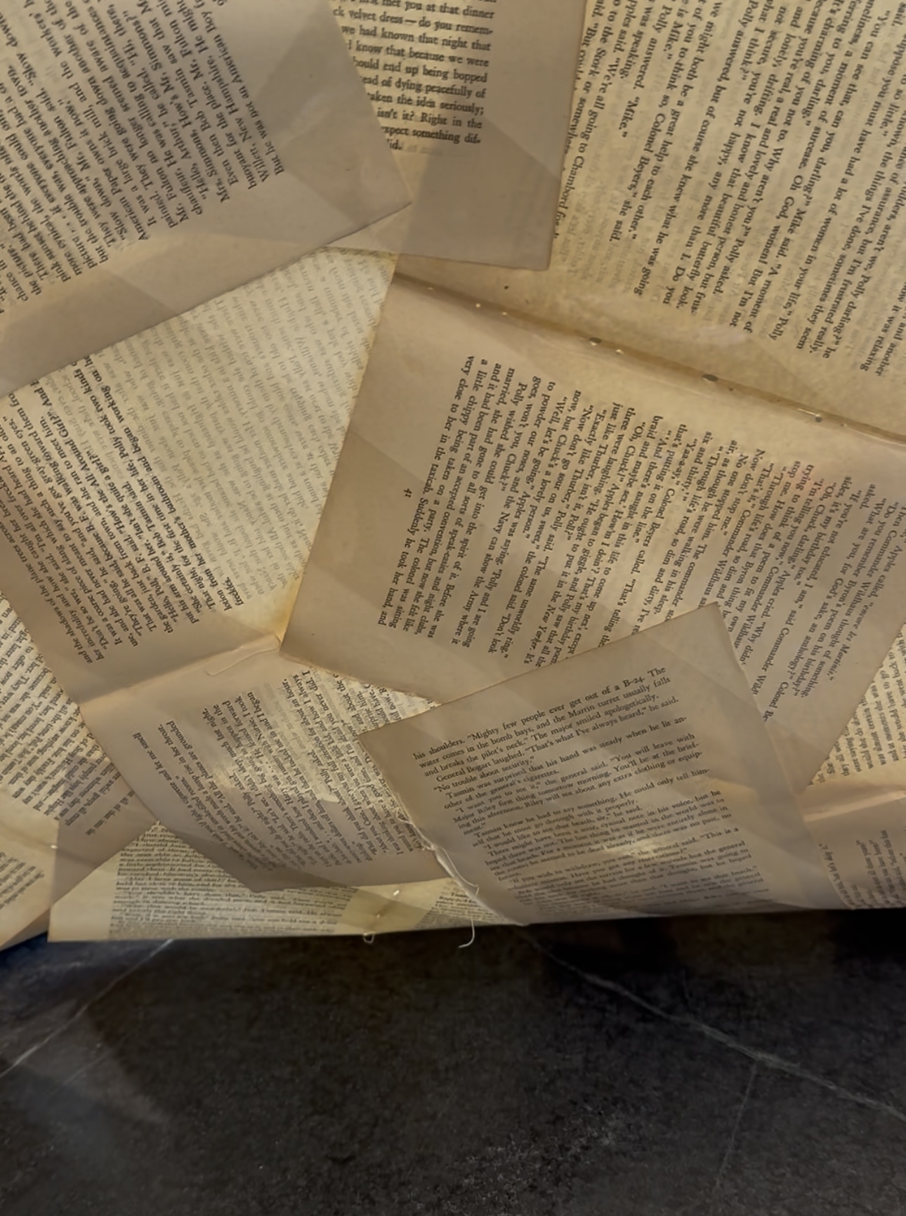 - Then we carefully tore pages from the book and laid them out on the rug—no pattern needed, just a casual, layered look.