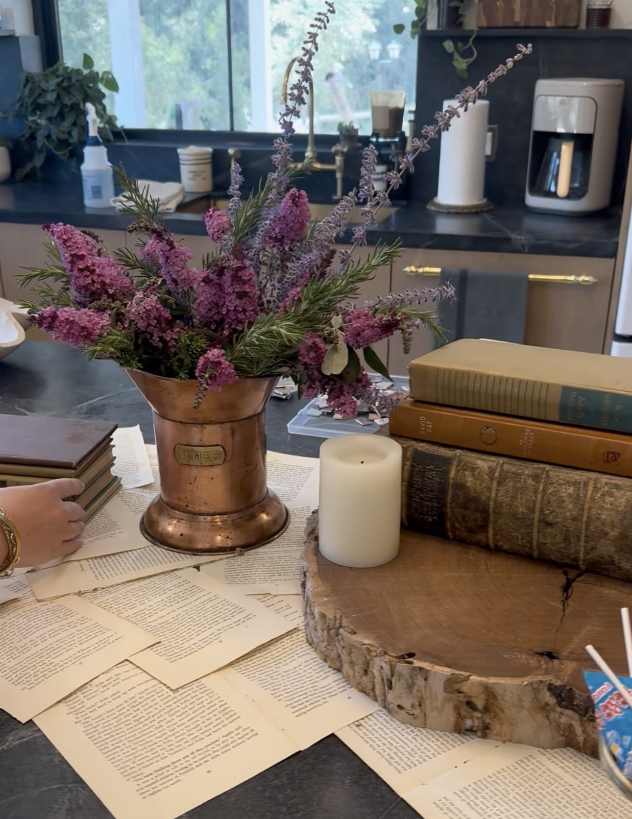 We started with a $3 antique book I found at a local shop—the pages were perfectly yellowed and worn, just begging to be repurposed. Our plan was to turn them into a book page runner for the kitchen island.