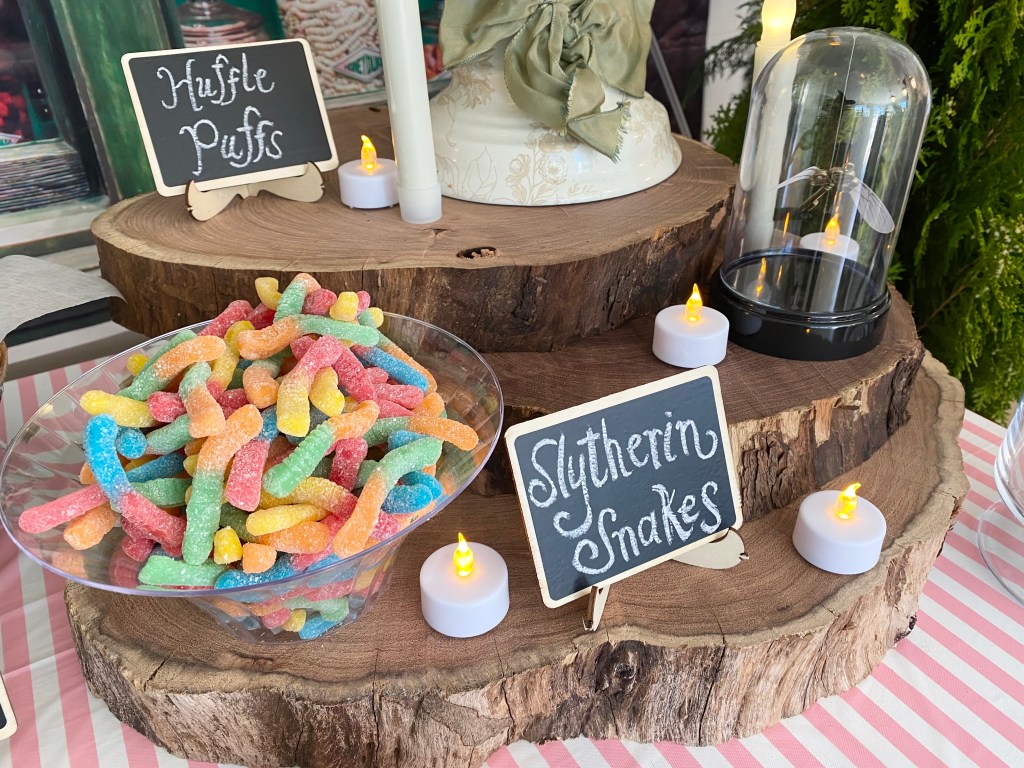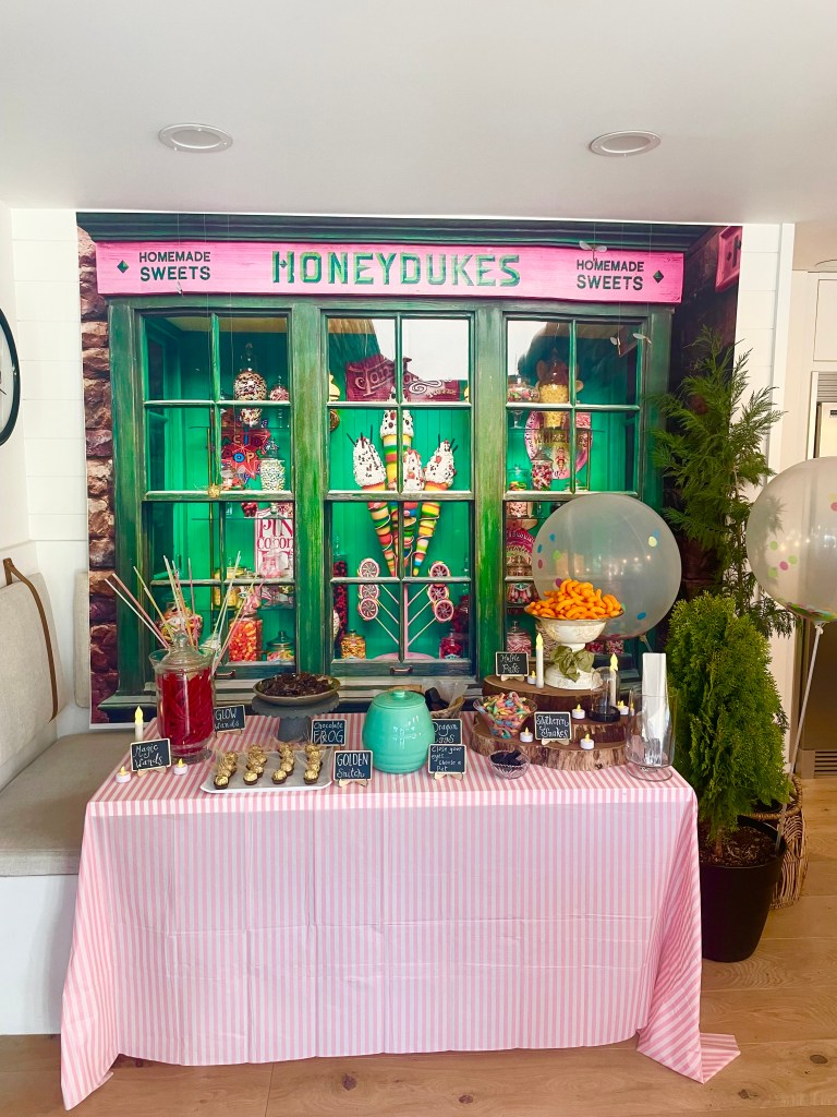 For the food setup, I created our very own Honeydukes Sweet Shop, and it was honestly one of my favorite parts of the entire party. I staged all the treats in front of a backdrop and brought in real plants to frame the scene—so it felt like you were peeking into the storefront from the outside. The whole thing had such a charming, whimsical vibe.