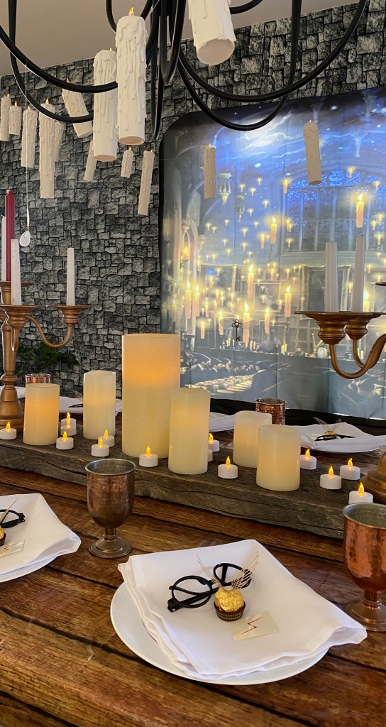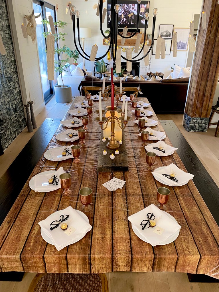 For the table setup, I wanted it to feel like we had stepped straight into the Great Hall. Since our table is white, I ordered a wood grain-style plastic tablecloth from Amazon to give it a more rustic, Hogwarts-worthy look. I even wrapped part of the walls with it to extend the illusion and make the whole space feel more immersive.